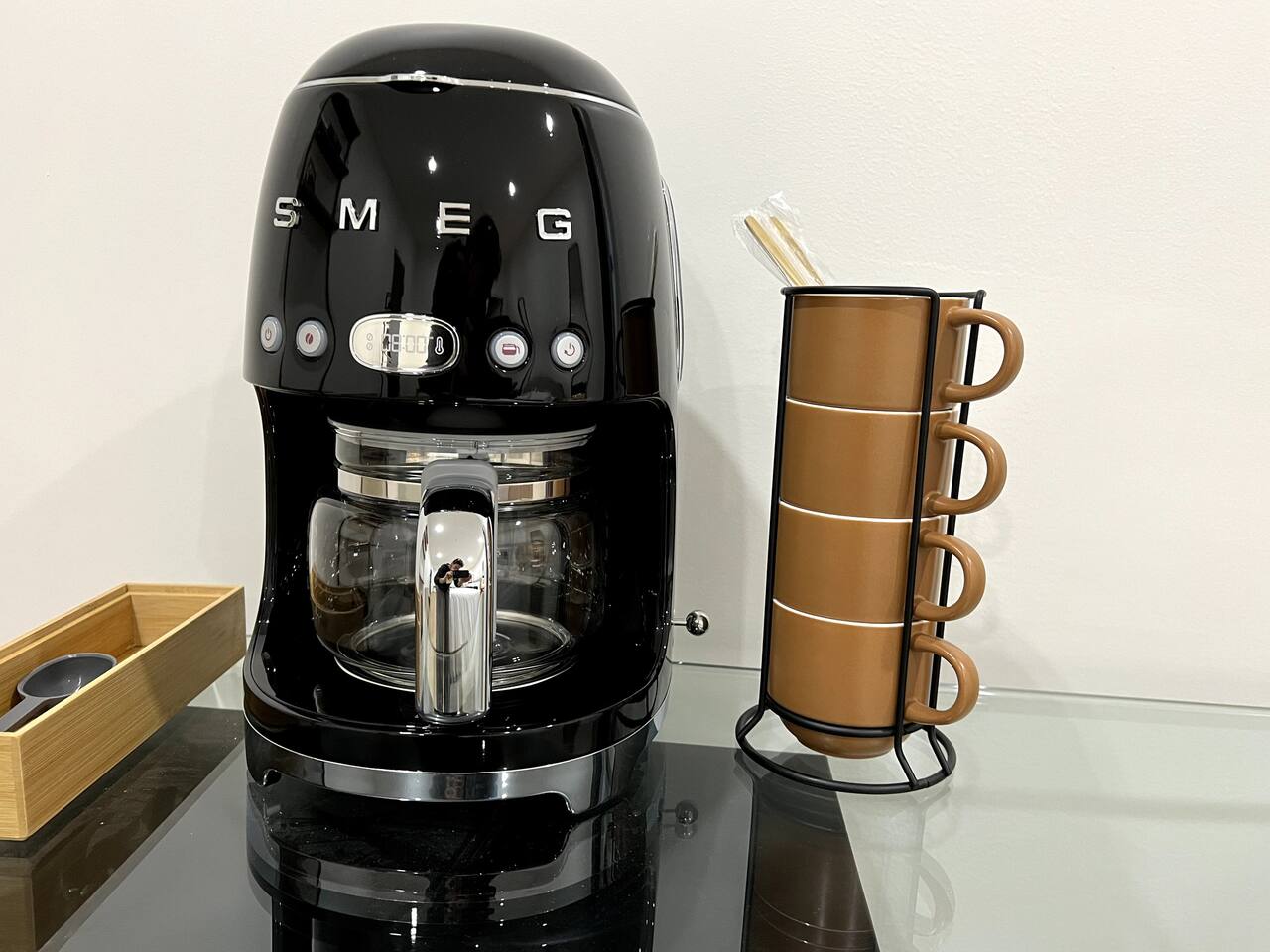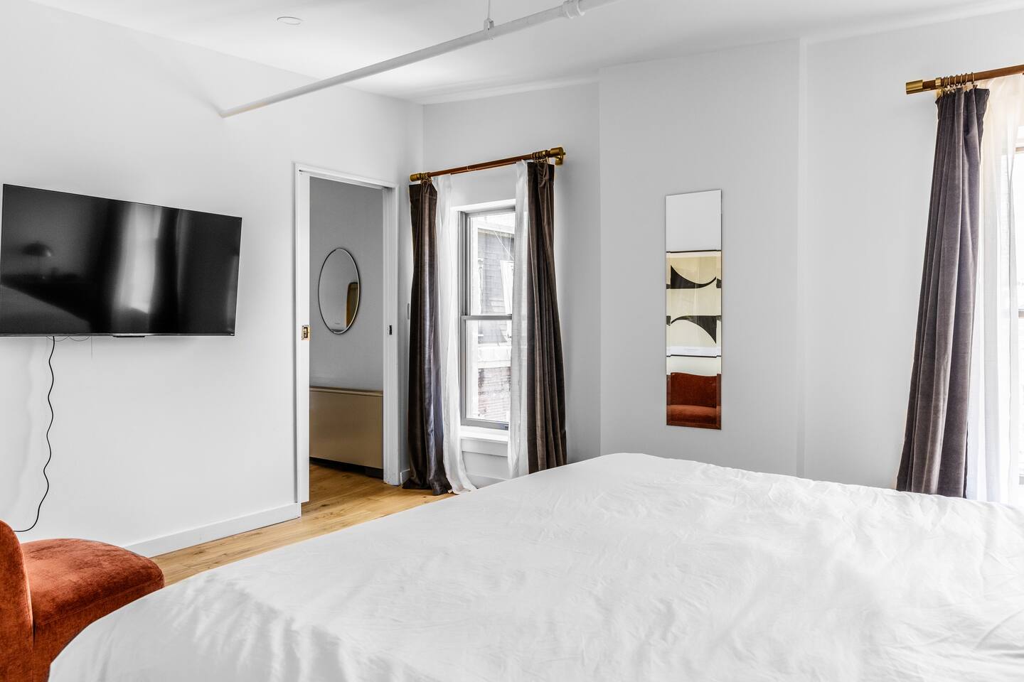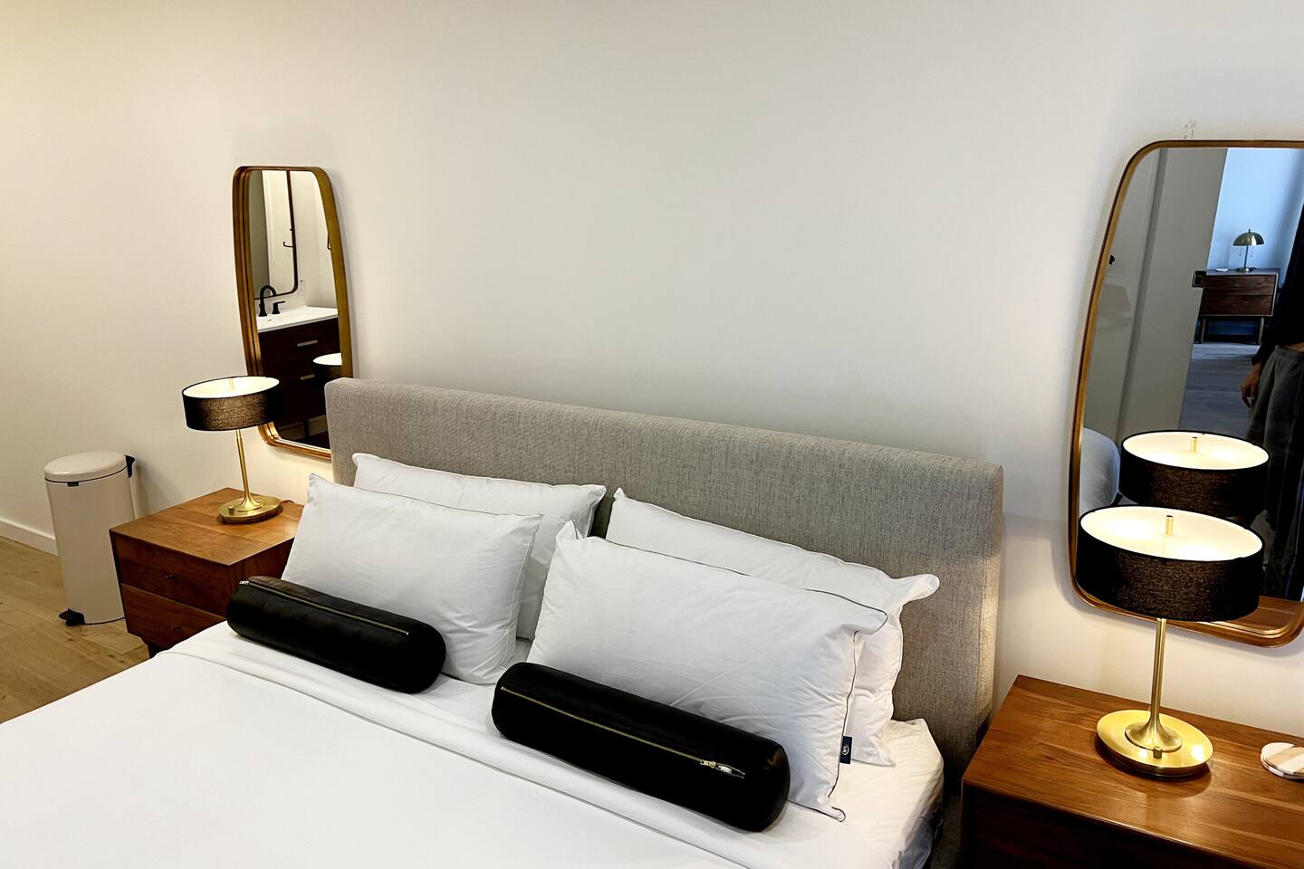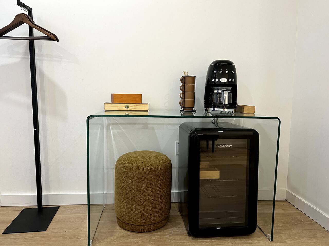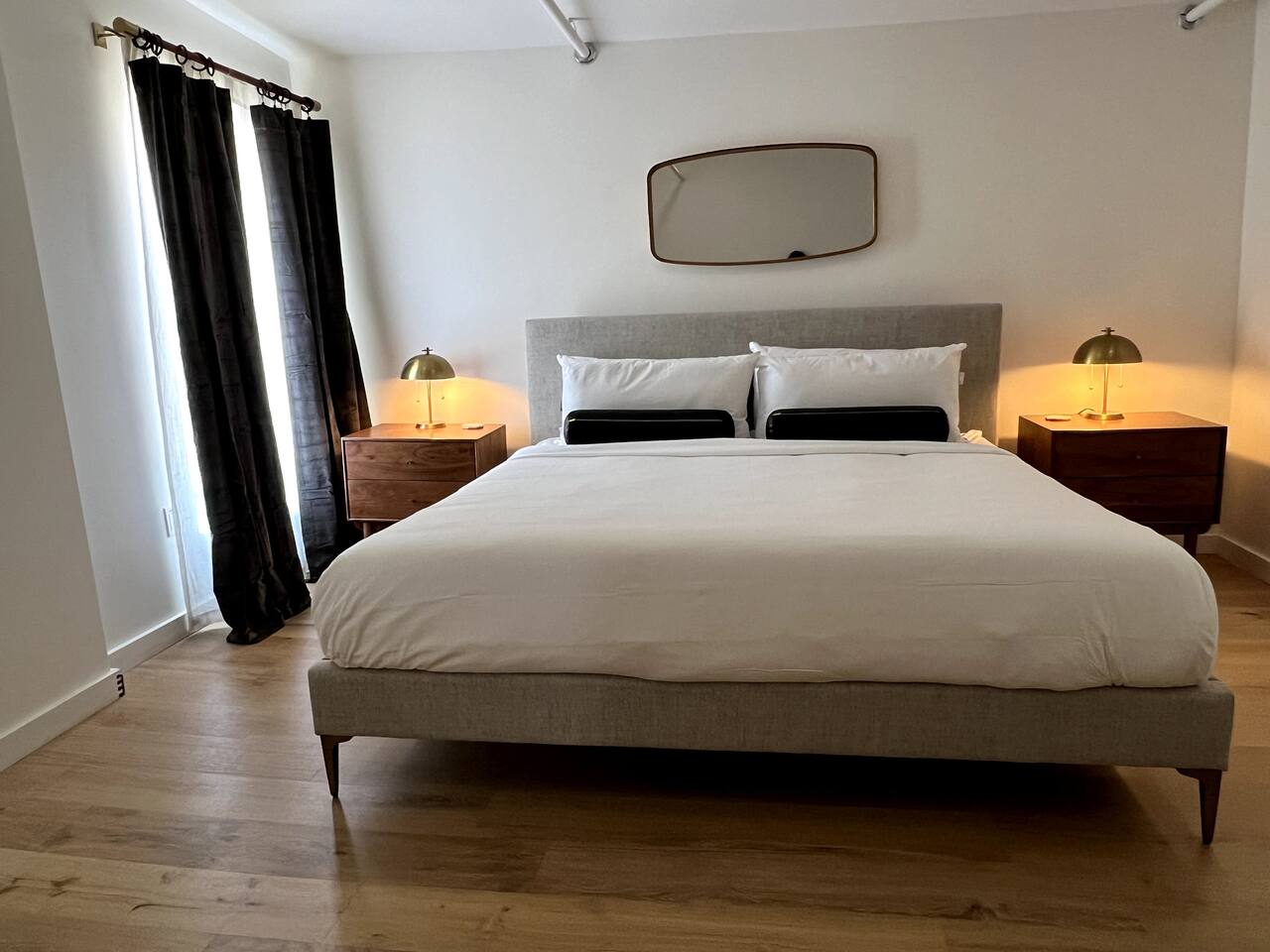 2 Room Suite w/ King bed in each room: • SMEG drip coffee maker w/ locally roasted coffee, cream, sugar, & boxed waters provided. • Mini fridge • Teak wood vanity w/ hairdryer in top drawer • Marble floor bathroom w/ step-in shower THE BUILDING & COMMON AREAS: • Lobby w/ ample solo or group seating options. Chess & Checkers game table. • Water & ice dispenser, microwave, & luggage storage area. • Chimera Coffee shop located on ground floor of the building • Free guest laundry room