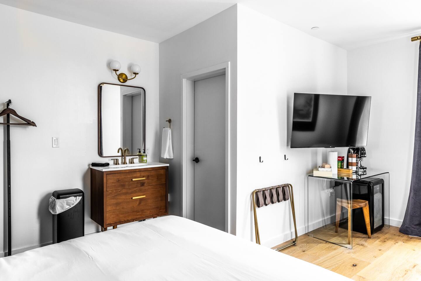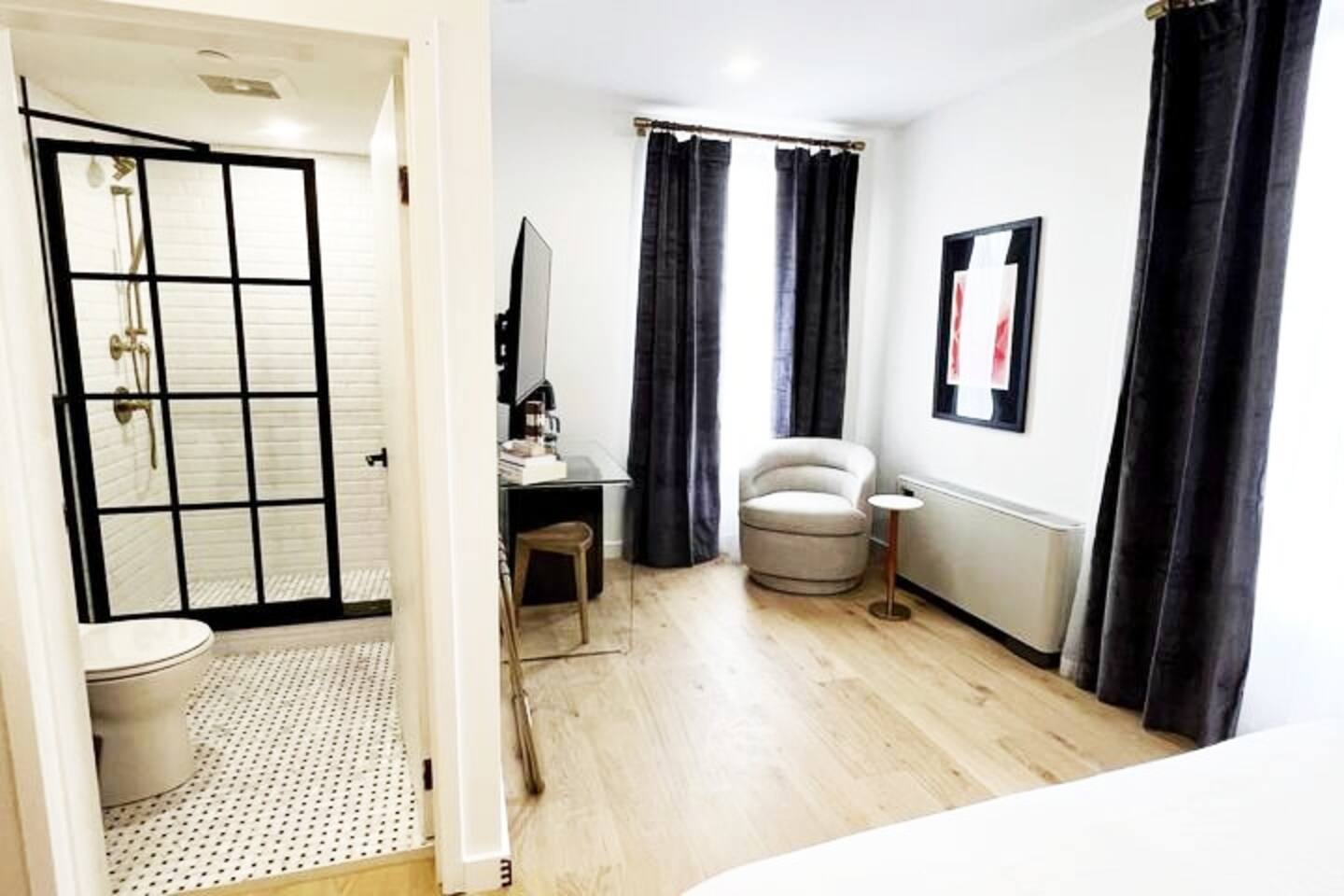 A studio style 2nd floor corner unit w/ views of Kenduskeag canal: • SMEG drip coffee maker w/ locally roasted coffee, cream, sugar, & Boxed waters provided. • Mini fridge • Teak wood vanity w/ hairdryer in top drawer • Marble floor bathroom w/ step-in shower THE BUILDING & COMMON AREAS: • Beautiful Lobby w/lots of seating. Chess & Checkers game table. • Water & ice dispenser, microwave, & luggage storage room. • Chimera Coffee shop located on ground floor of the building • Free guest laundry room
