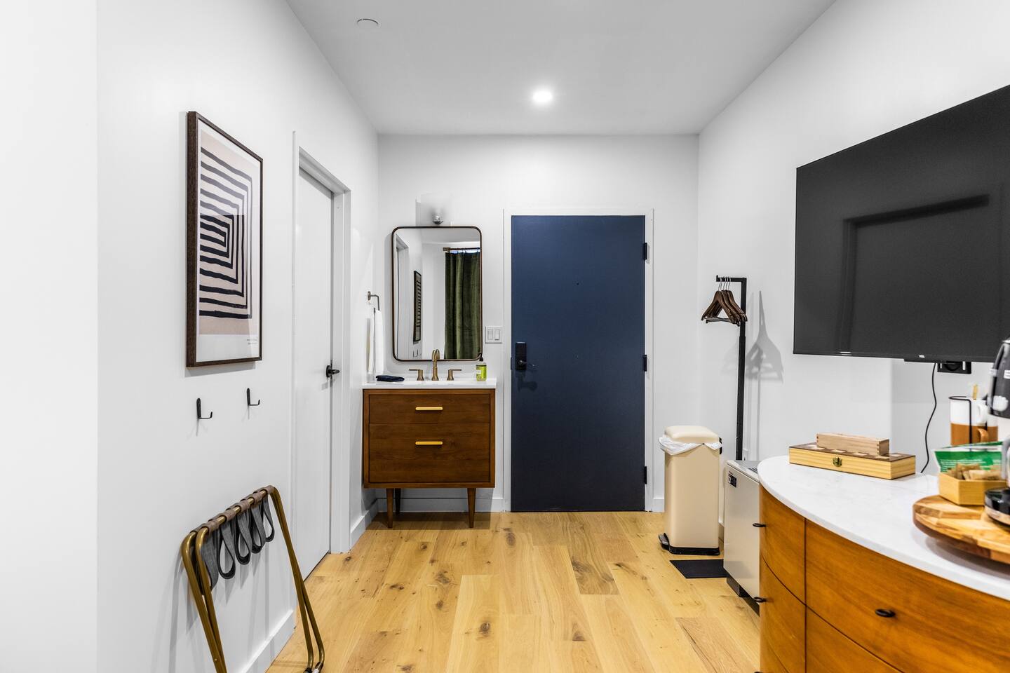 A studio style ground floor unit: • SMEG drip coffee maker w/ locally roasted coffee, cream, sugar, & Boxed waters provided. • Mini fridge • Teak wood vanity w/ hairdryer in top drawer • Marble floor bathroom w/ step-in shower THE BUILDING & COMMON AREAS: • Beautiful Lobby w/lots of seating. Chess & Checkers game table. • Water & ice dispenser, microwave, & luggage storage room. • Chimera Coffee shop located on ground floor of the building • Free guest laundry room
