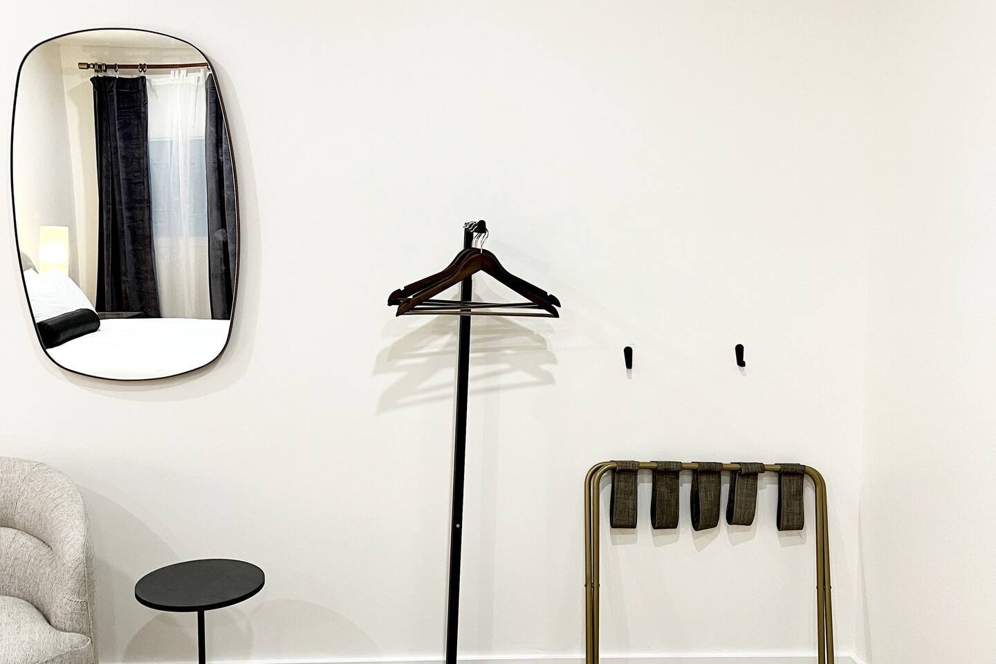 A 3rd floor studio style unit, INTERIOR room with no outside windows: • SMEG drip coffee maker w/ locally roasted coffee, cream, sugar, & Boxed waters provided. • Mini fridge • Marble floor bathroom w/ step-in shower THE BUILDING & COMMON AREAS: • Beautiful Lobby w/lots of seating. Chess & Checkers game table. • Water & ice dispenser, microwave, & luggage storage room. • Chimera Coffee shop located on ground floor of the building • Free guest laundry room