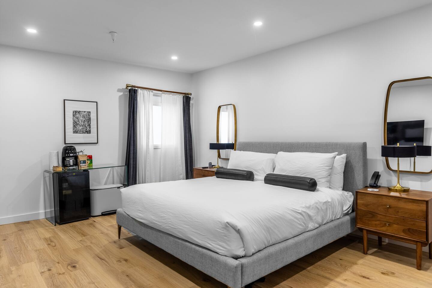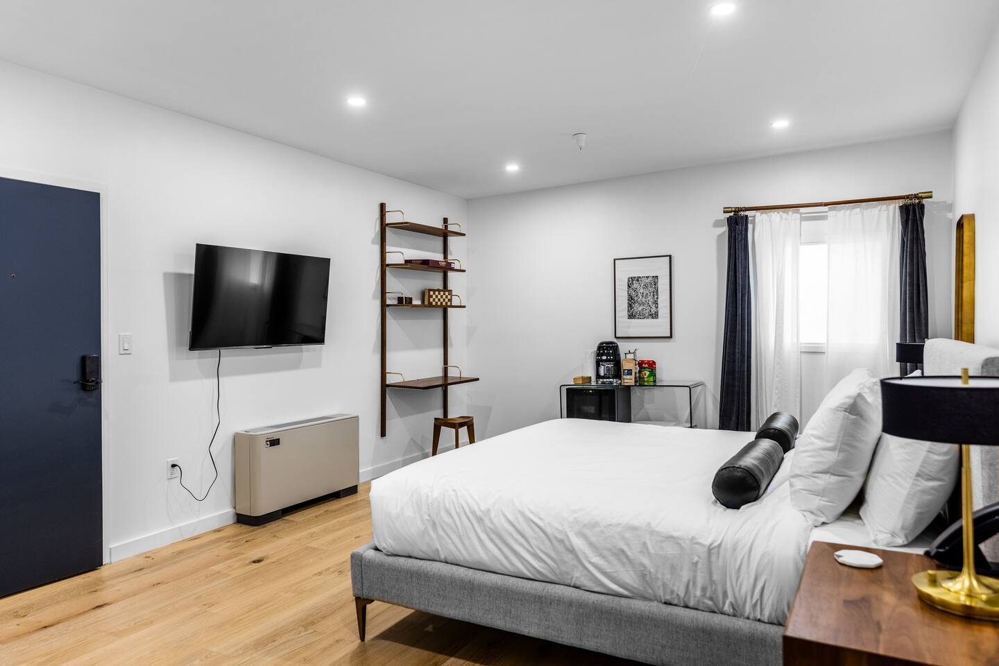 A large studio style top floor unit, INTERIOR unit w/ no outside windows: • SMEG drip coffee maker w/ locally roasted coffee, cream, sugar, & boxed waters provided. • Mini fridge • Walnut wall desk • Teak wood vanity w/ hairdryer in top drawer • Marble floor bathroom w/ step-in shower THE BUILDING & COMMON AREAS: • Lobby w/ ample solo or group seating options. Chess & Checkers game table. Perfect for work or socializing. • Water & ice dispenser, microwave, & luggage storage area. • Chimera Coffee shop located on ground floor of the building • Free guest laundry room