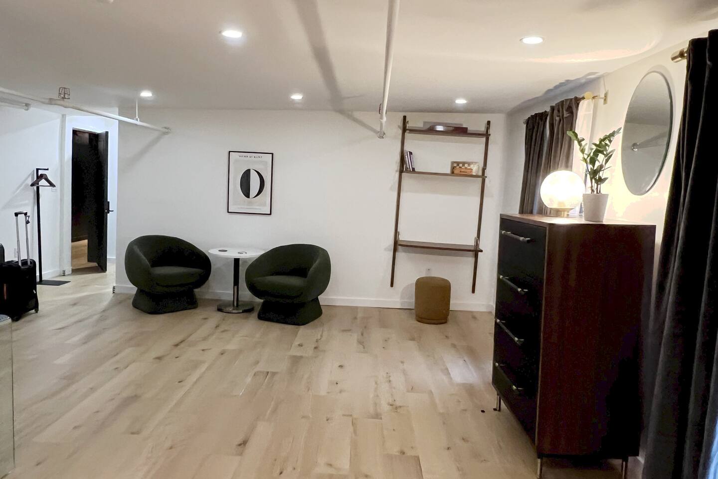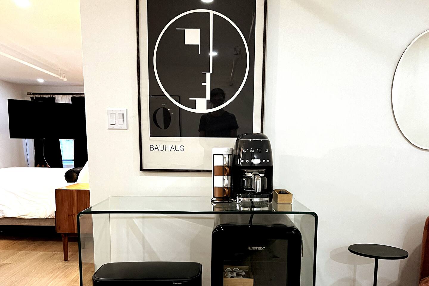A large top floor studio style unit • SMEG drip coffee maker w/ locally roasted coffee, cream, sugar, & BOXED WATERS provided. • Mini fridge • Wall desk • Small dining table w/ 2 upholstered chairs • Teak wood vanity w/ hairdryer in top drawer • Marble floor bathroom w/ step-in shower THE BUILDING & COMMON AREAS: • Lobby w/ ample solo & group seating options. Chess & Checkers game table. • Water & ice dispenser, microwave, & luggage storage room. • Chimera Coffee shop located on ground floor of the building • Free guest laundry room
