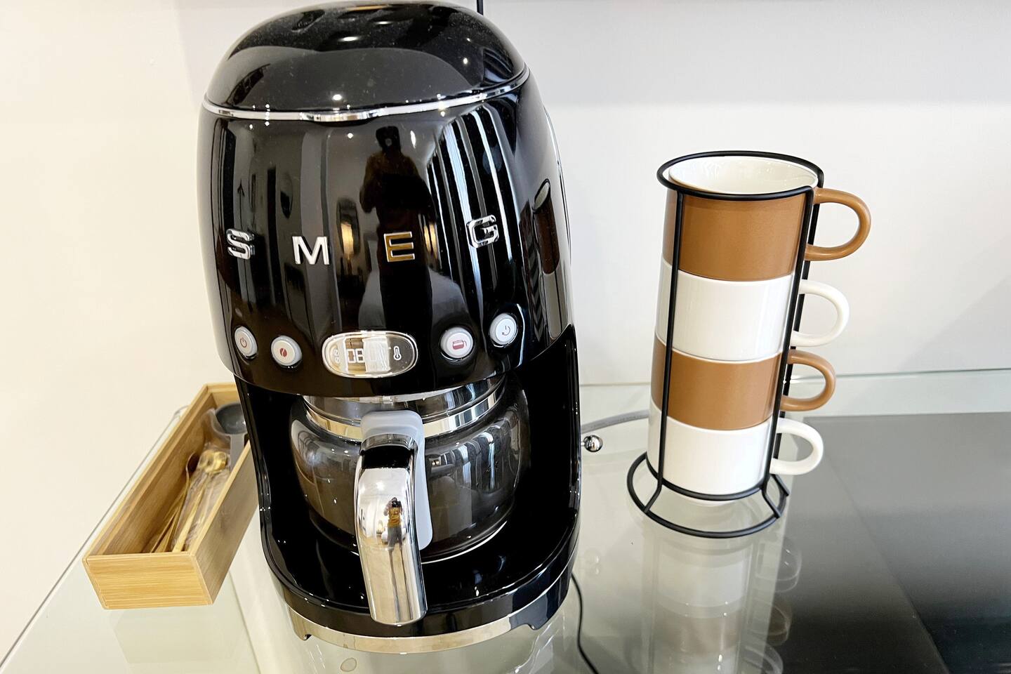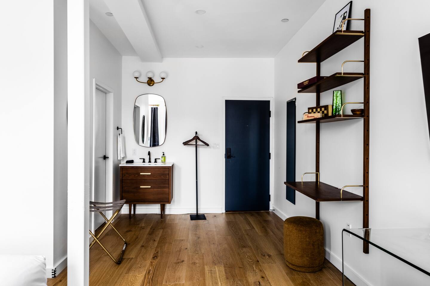 A large studio style 3rd floor premium front facing unit w/ views of Market Square: • SMEG drip coffee maker w/ locally roasted coffee, cream, sugar, & boxed waters provided. • Mini fridge • Teak wood vanity w/ hairdryer in top drawer • Marble floor bathroom w/ step-in shower THE BUILDING & COMMON AREAS: • Lobby w/ ample solo or group seating options. Chess & Checkers game table. Perfect for work or socializing. • Water & ice dispenser, microwave, & luggage storage area. • Chimera Coffee shop located on ground floor of the building • Free guest laundry room