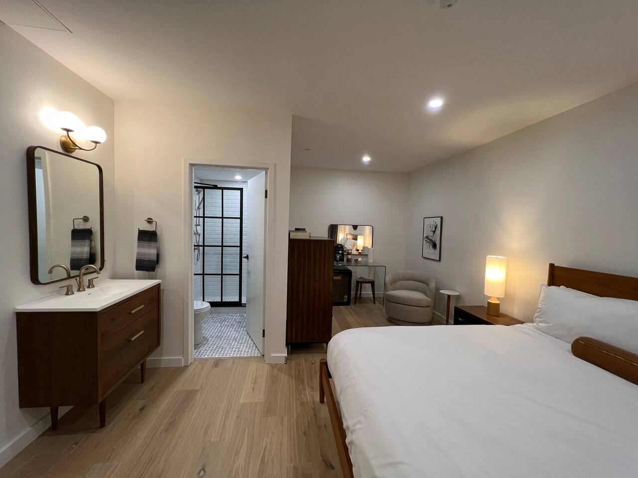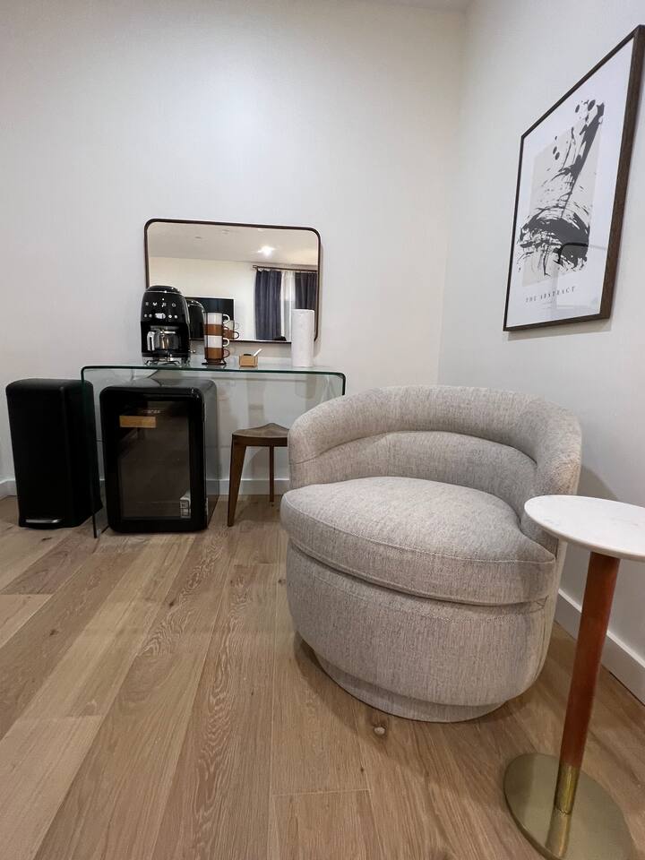 A studio style unit on the 2nd floor, INTERIOR room w/ no outside window: • SMEG drip coffee maker w/ locally roasted coffee, cream, sugar, & Boxed waters provided. • Mini fridge • Teak wood vanity w/ hairdryer in top drawer • Marble floor bathroom w/ step-in shower THE BUILDING & COMMON AREAS: • Beautiful Lobby w/lots of seating. Chess & Checkers game table. • Water & ice dispenser, microwave, & luggage storage room. • Chimera Coffee shop located on ground floor of the building • Free guest laundry room